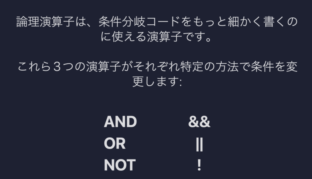 論理演算子… このあたりもWordPressではよく使いますね。 ではいってみましょう! 【論理 AND(&&) 演算子】 全ての条件がtrue(真)の時にのみ実行される if 条件A && 条件B { 条件A かつ(&&) 条件Bを満たすときに実行される } 【論理 OR(||) ... (広告)